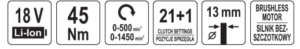 Versatile, lightweight drill/driver for workshop and construction site use. The steel planetary gearbox and brushless motor combine power, comfort and efficient operation. The tool housing is resistant to mechanical damage. Components in contact with the user’s hand are made of certified materials that do not contain harmful ingredients. The air circulation in the screwdriver has been designed in such a way that the user, when pressing down on it with both hands, does not cause the circulation to stop. This prevents an uncontrolled temperature rise inside the unit and helps remove dust from the winding. The user has the ability to precisely control the speed of the screwdriver by gradually depressing the trigger. This is particularly important when using brushless tools with high speeds in 2nd gear.
